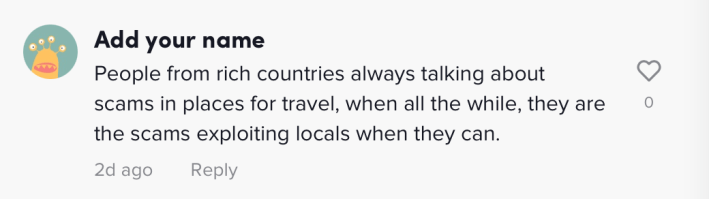"People from rich countries always talking about scams in places for travel, when all the while, they are the scams exploiting locals when they can," one commenter wrote.