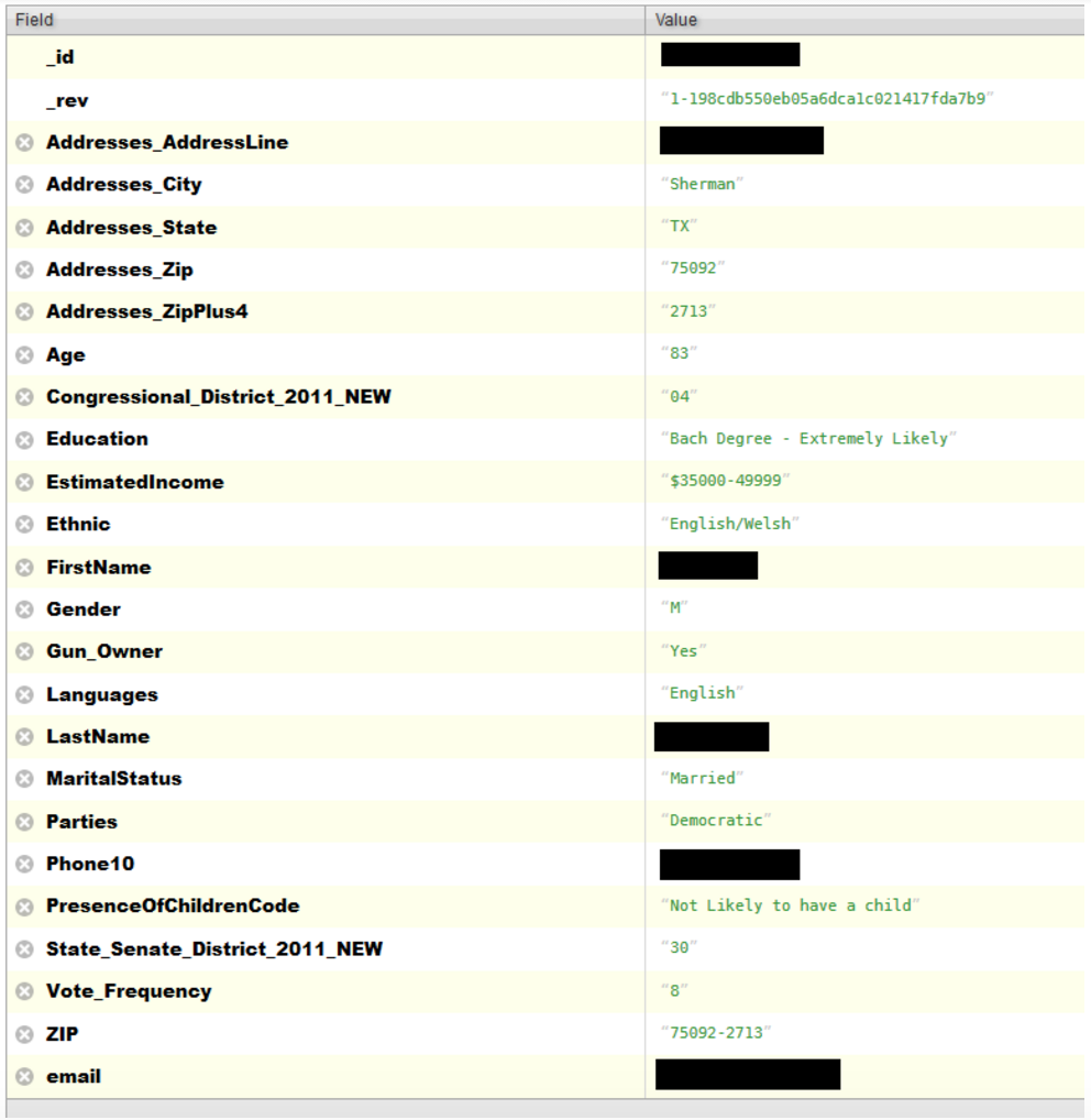 One of the most frustrating aspects of finding exposed databases is that there is often no indication who owns the database or whom to contact about it. In attempting to track down the owner of the database so that he could notify them of their exposure, Vickery noticed that the voter ID field was labeled “LALVOTERID.” Some Google searching him led to suspect that this might be a list somehow linked to L2, a company specializing in voter data utilization.