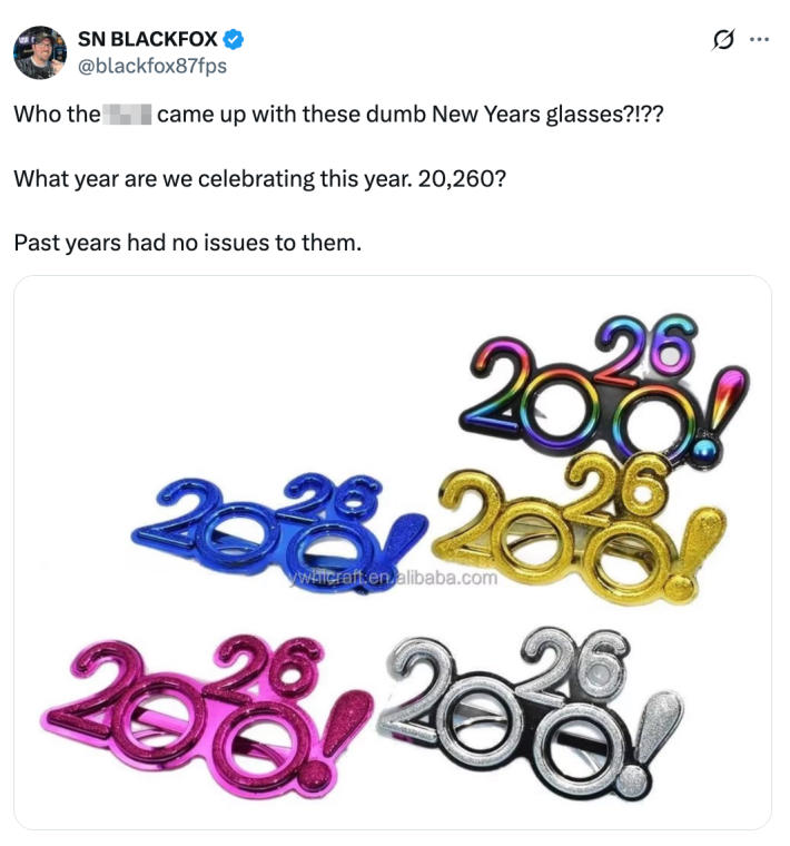 "Who the [expletive] came up with these dumb New Year's glasses?!??" asked @blackfox87fps. "What year are we celebrating this year. 20,260?"