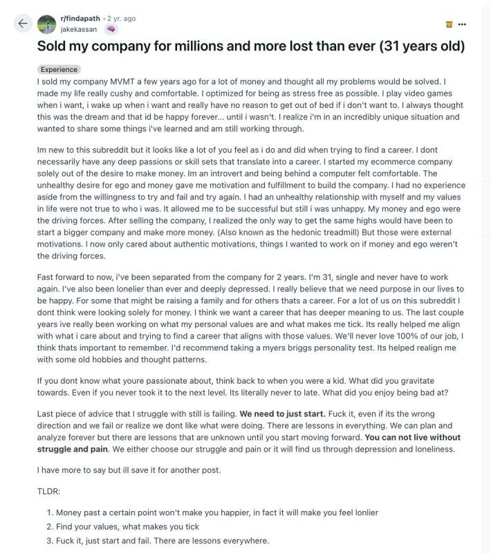 Many say "money can't buy happiness," and one millionaire whose message is making the rounds on the internet agrees. Despite selling his startup for millions, Jake Kassan admitted on Reddit that he was lost and unhappy and gave advice to those on how to fare better.