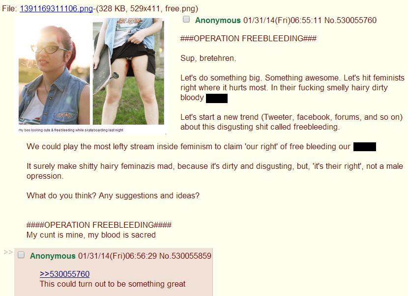 4chan followed this up with Operation Freebleeding, which tried to convince women that the use of sanitary pads was a male construction to keep them down.