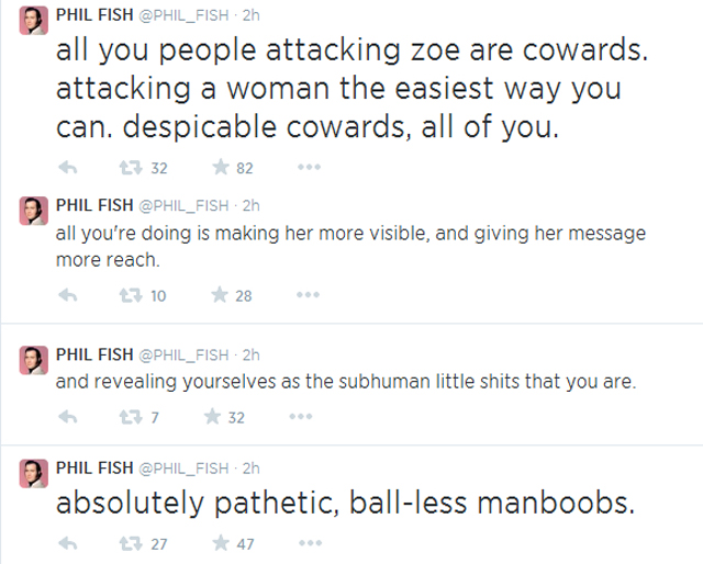 Sunday night after the allegations hit, Quinn's friend Phil Fish came to her aid, launching a strident defense of her character on social media: