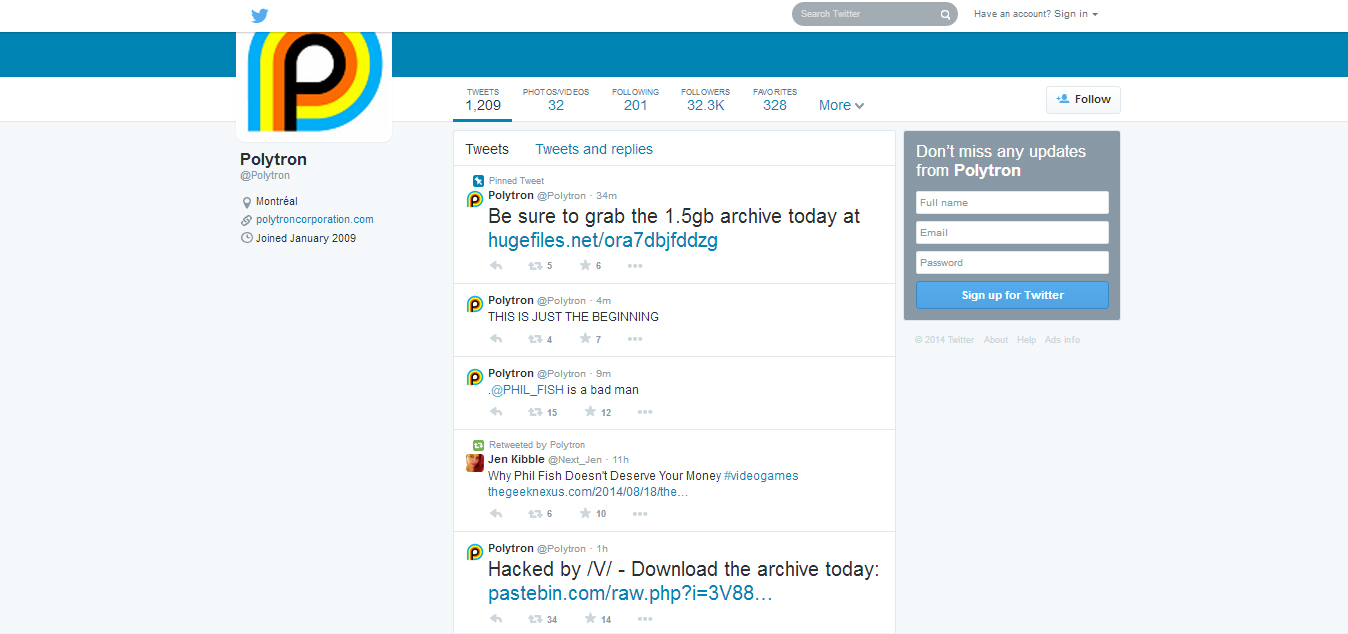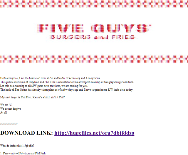 Hello everyone, I am the head mod over at /V/ and leader of 4chan.org and Anonymous. This public execution of Polytron and Phil Fish is retaliation for his attempted coverup of five guys burger and fries. Let this be a warning to all SJW game devs out there, we are coming for you. The hack of Zoe Quinn has already taken place as of a few days ago and I have targeted more SJW indie devs today.