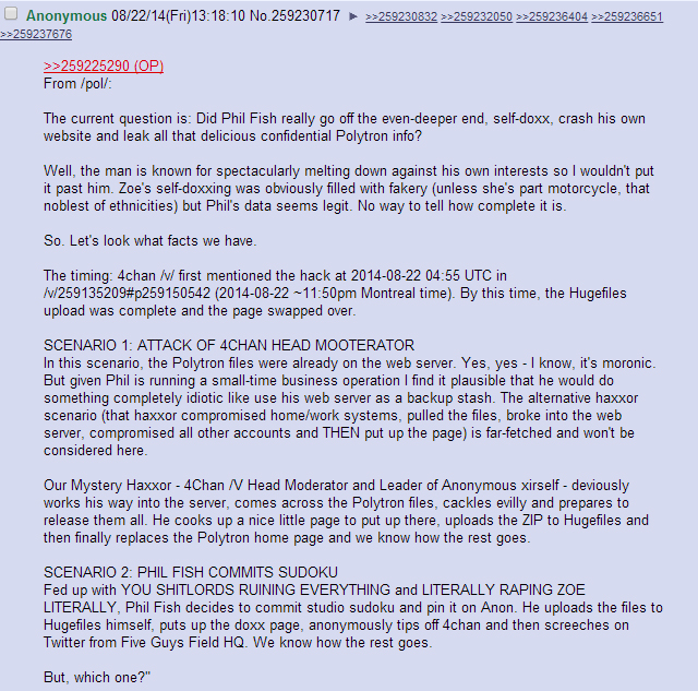 As for Quinn, she urged Twitter to report the hacked Polytron account. She also argued it was hard for her detractors to claim Fish's website hack was faked, because they'd made the same claim she was responsible for hacking her own Tumblr and doxxing herself earlier in the week: