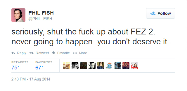 Fish has long had a love-hate relationship with social media and the gaming community. Last month he canceled development on his game Fez II, stating that he wanted to leave the abusive culture of the gaming community.