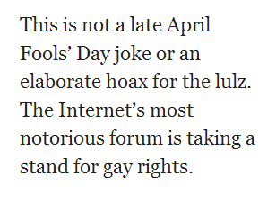 This is not a late April Fools' Day joke or an elaborate hoax for the lulz. The Internet’s most notorious troll forum—a place where meaningful discourse is shrouded in juvenile innuendo or derailed completely by graphic images of genitalia—is taking a stand for gay rights.