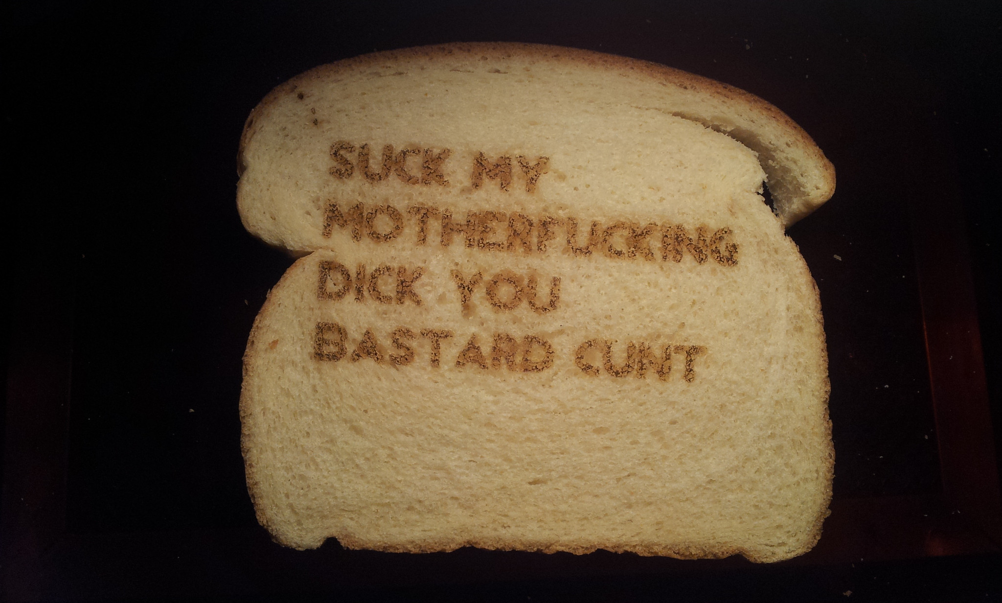 Give a Reddit user a laser engraver and he’ll transform pieces of wood into beautiful illustrations of memes like Overly Attached Girlfriend and actor Aziz Ansari. Give one of these machines to a dude from 4chan’s /b/, the Internet’s worst nightmare come to life, and he’ll make toast art of Jesus Christ, Adolf Hitler, and, of course, the F-word.