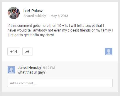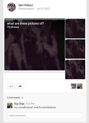 This hatred spilled over to Palosz's Google+ profile, where /b/ raided his posts with the following messages. (Warning: The posts contain obscene language and are likely not safe for work.)