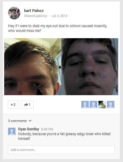 The profile page belonged to 15-year-old Bartlomiej "Bart" Palosz, who fatally shot himself with his family's shotgun on Aug. 27. According to the Stamford Advocate, Palosz was bullied on Facebook, had his Android phone smashed on the floor, was pushed down some stairs at Connecticut's Greenwich High School, and regularly insulted for his Polish accent.