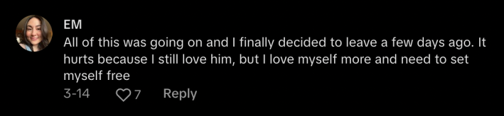 Others voiced agreement by responding with their own stories of leaving toxic relationships in response to alienation caused by silent cheating behaviors. 'All of this was going on and I finally decided to leave a few days ago. It hurts because I still love him, but I love myself more and need to set myself free,' was shared by TikTok user @emily_s0318.