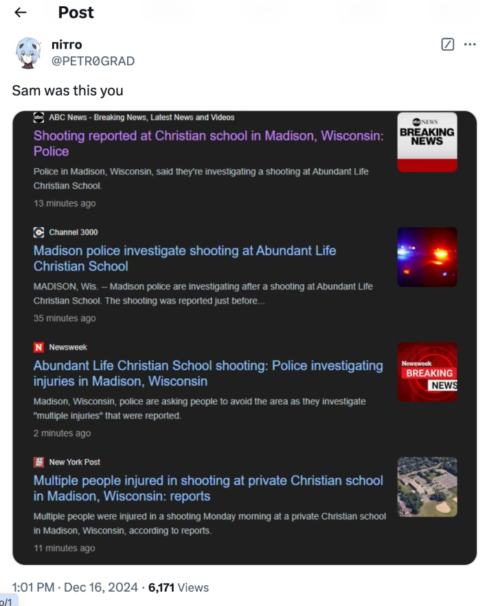 Update: 7:38am CT, Dec. 7: Police last night identified the shooter as Natalie Rupnow, of Madison, Wisconsin, confirming she went by "Samantha: online. The X account associated with her is now private after a friend who said they had access locked it down.