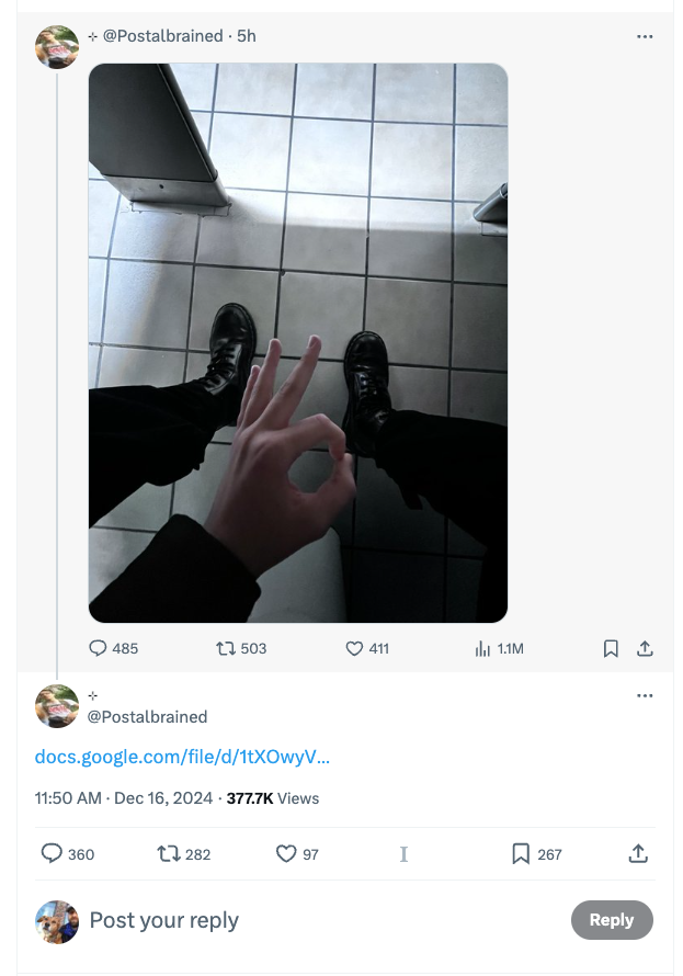 The account, @postalbrained, shared an image of a person sitting in a restroom and holding their finger in an "OK" sign.