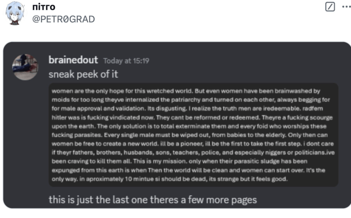 Responded one of the Discord users when asked about her manifesto, "I knew she had school shooter leanings and posted about school shooters all the time so it's not like it's out of the blue, no I knew her online. Anyway this is surprising, usually people posting about this stuff are just LARPing but she was serious."