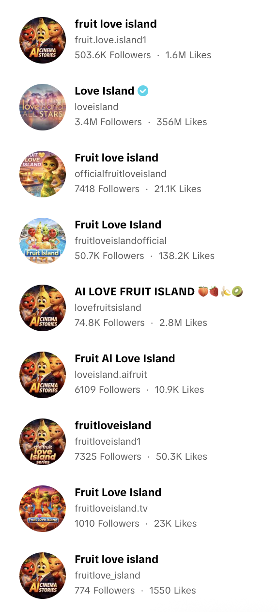 Meanwhile, many copycat accounts have popped up producing AI fruit content, with some even calling themselves "Fruit Love Island" (Peacock, you might want to put in a call with your lawyers).