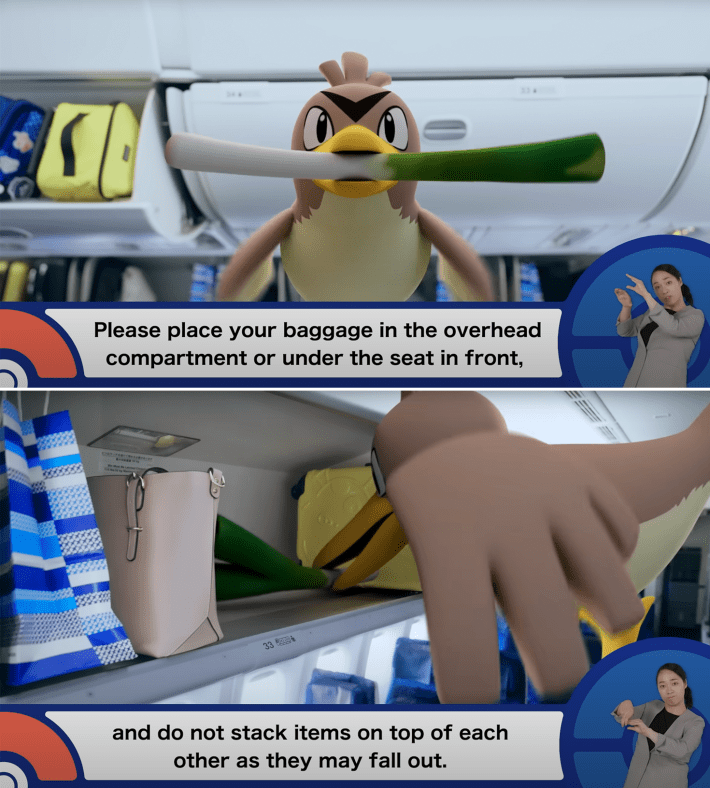 The video features Pikachu and his buds demonstrating all the safety instructions you’ve come to expect from any decent in-flight video. Like overhead compartment protocol from Farfectch'd: