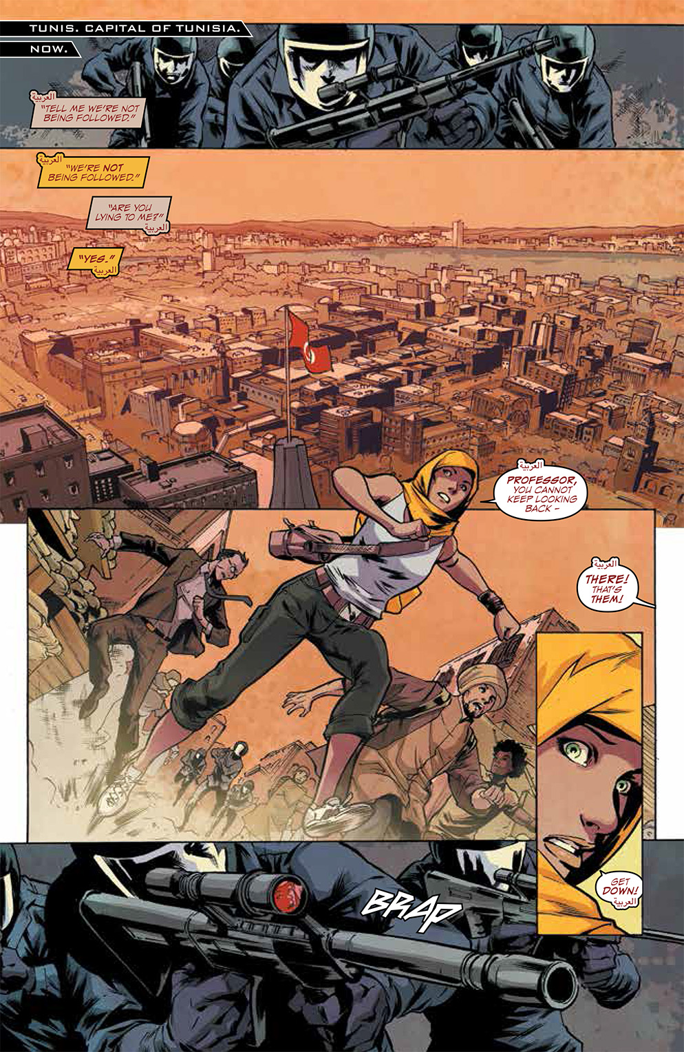 She adds that it was important to have a strong female character as well. The action of the story jumps back and forth between the men and Sirine, the woman on the ground amidst a revolution, and on the novel’s cover.