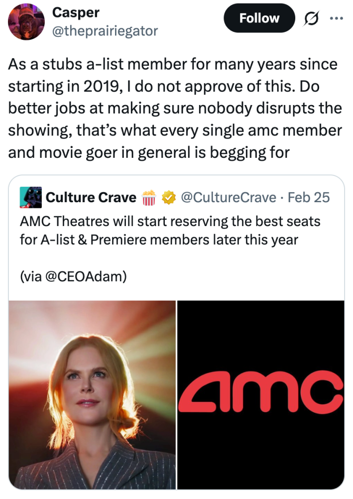 Maybe that had something to do with the price hikes for A-List memberships—now up to $27.99 per month. Adding new perks to justify the cost sounds like a good move, but reactions to the preferred seating idea aren't painting a bright picture for AMC's future.