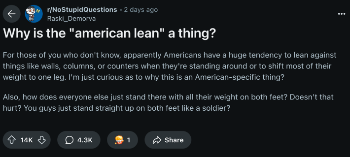 Americans responded that the lean is a casual, non-threatening way to take up space that is simply comfortable. Others mentioned that they squat while they wait and connected this behavior to European and Southeast Asian cultures. People brought up the CIA thing. Many argued that “the American lean” is not a thing because everyone does it.