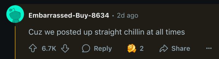 “Cuz we posted up straight chillin at all times,” said @Embarrassed-Buy-8634.