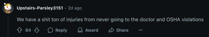 “We have a sh*t ton of injuries from never going to the doctor and OSHA violations,” said Upstairs-Parsley3151.