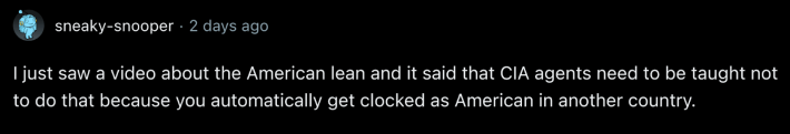 “I just saw a video about the American lean and it said that CIA agents need to be taught not to do that because you automatically get clocked as American in another country,” said @sneaky-snooper.