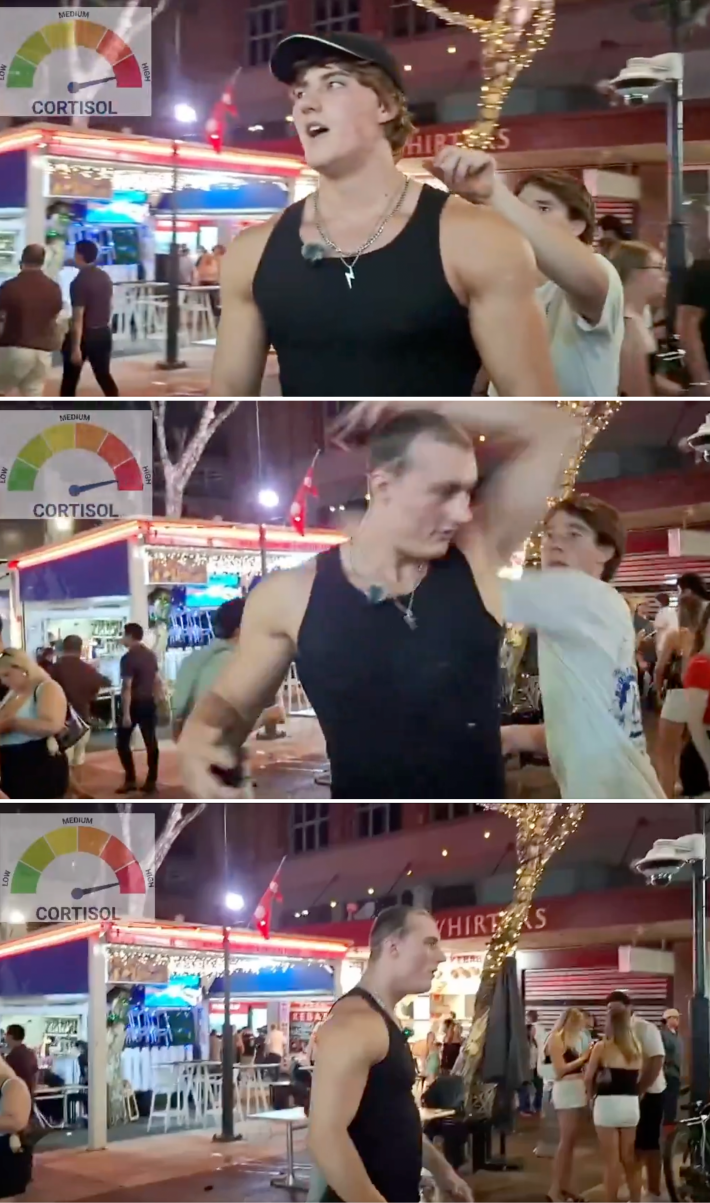 Suddenly, a stranger stepped in from behind Androgenic and ripped off the hat and attached hair in one quick motion before running away.