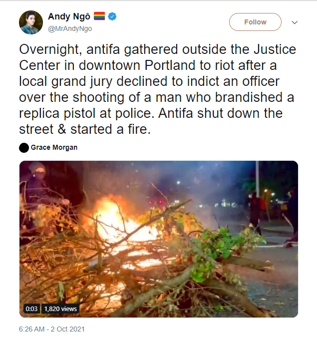 When Ngo reposted it, he wrote, "Police observe the rioting #antifa from behind a gate in downtown Portland last night."