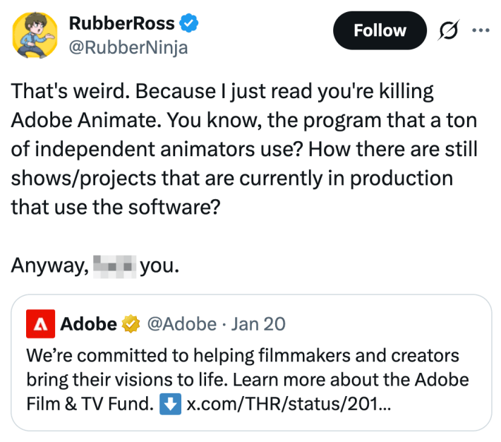 In a response to a January tweet from Adobe about how they are "committed to helping filmmakers and creators," @RubberNinja replied: