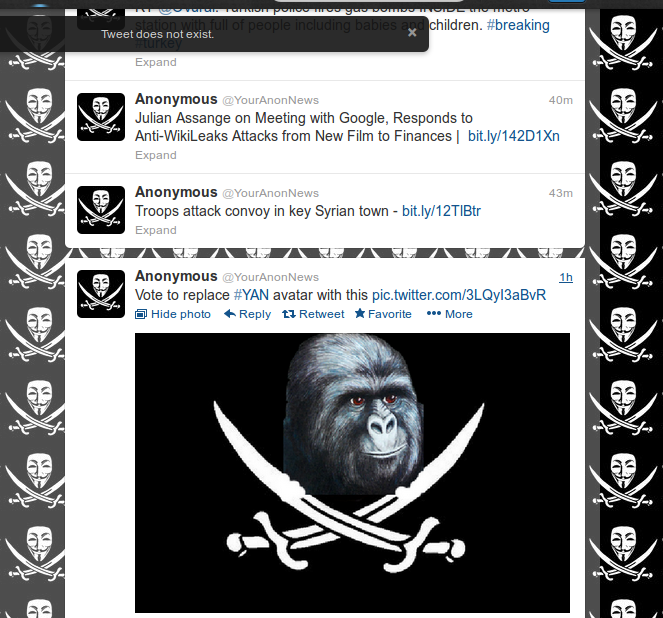 At about 4:30am Pacific time, YAN administrator Jackal Anon, who had been asleep, regained access to the account and began deleting the offending tweets. Goatse images can and do get accounts suspended, hacked or not. YAN began tweeting news relating to the Syrian civil war and Turkish demonstrations.