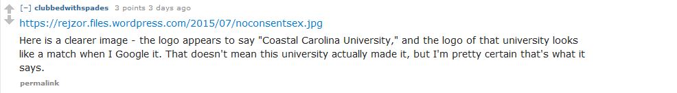 Debbie Conner, the vice president for campus life and student engagement at Coastal Carolina University, confirmed to the Daily Dot that the poster originated from the university. Conner said it was published in 2008 by the Campus Assault Resource Education Support Coalition, made up of students, faculty, and staff at the university. “It went out of circulation in 2008,” she said.