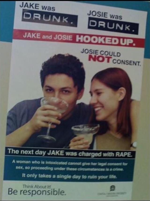 Jake was DRUNK. Josie was DRUNK.Jake and Josie hooked up. Josie could not consent.The next day JAKE was charged with RAPE.A woman who is intoxicated cannot give her legal consent for sex, so proceeding under these circumstances is a crime.It only takes a single day to ruin your life.Think About it! Be responsible.