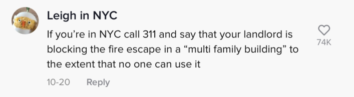 "If you're in NYC call 311 and say that your landlord is blocking the fire escape in a 'multi family building' to the extent that no one can use it," one commenter wrote.
