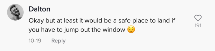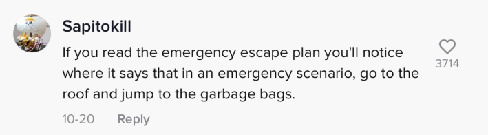 Other commenters joked about her having a soft place to land——in the trash——if she ever had to jump from the fire escape to reach the ground.