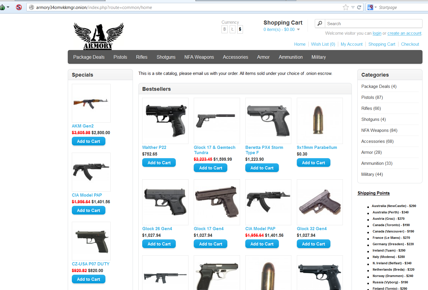 Deals on the Armory are nearly anonymous, of course. Money transactions are exclusively conducted in Bitcoin, and the site hides behind the encrypted Tor network, home of the Dark Web markets and other Deep Web sites. The store's owners boast of a global private shipping system with bases in 15 countries and a fleet of private trucks that allow buyers and sellers to avoid a postal system that has led to several arrests for Deep Web drug and gun buys.