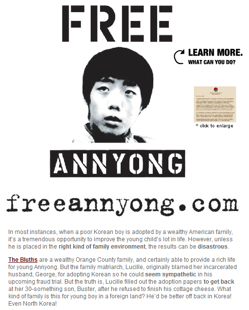Matriarch Lucille adopted a son from Korea just to get back at Buster. Freeannyong.com was campaigning to free the newest Bluth from the family "before their skewed values and utter lack of human decency destroys his life." And guess what? Fox owns the domain, and it is completely dead.