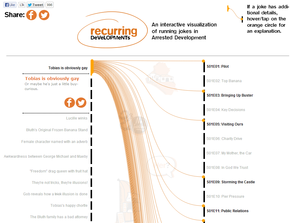 Enter Recurring Developments, a tool that highlights most—if not all—of the running jokes in the show, the episodes in which they appear, and the context of the gag in each episode.