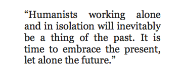 Humanists working alone and in isolation will inevitably be a thing of the past. It is time to embrace the present, let alone the future. The digital world is here to stay and constantly changing. We have to not only embrace it but help to shape it.