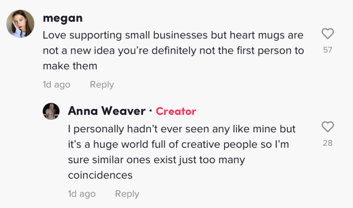 Answering another commenter who shared a similar sentiment, Weaver said she hadn't seen mugs that looked so similar to the ones she had created.