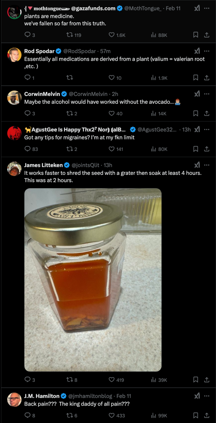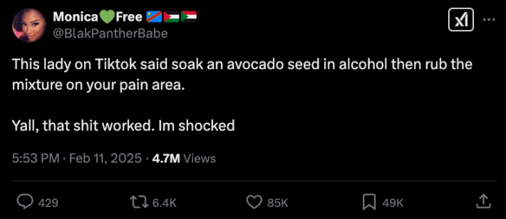 On Feb. 11, 2025, X user @BlakPantherBabe shared with her followers that she had tried the mixture, and was surprised at how effective it was. "This lady on TikTok said soak an avocado seed in alcohol then rub the mixture on your pain area. Y'all, that sh*t worked. I'm shocked."
