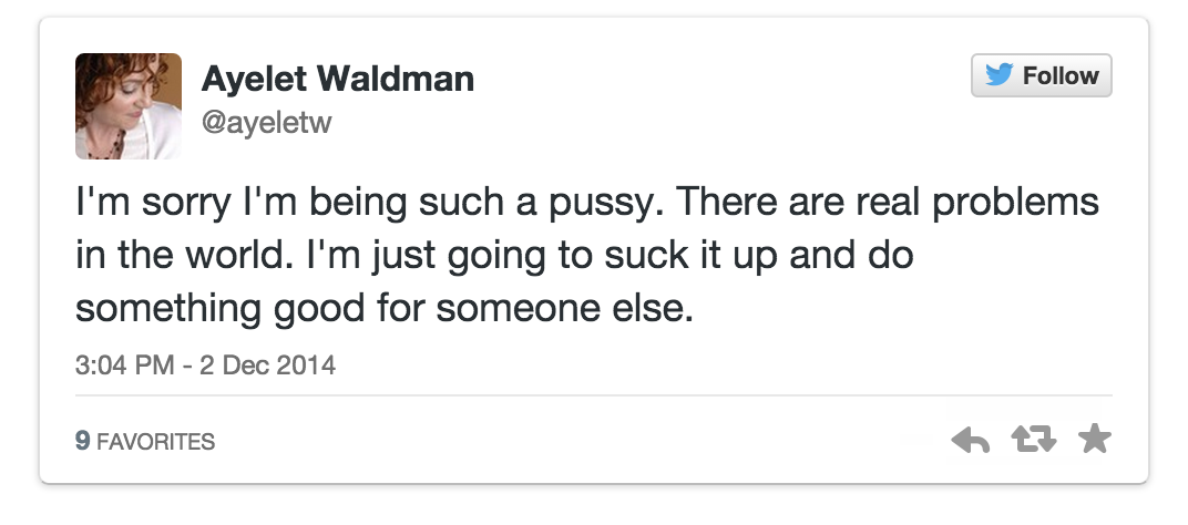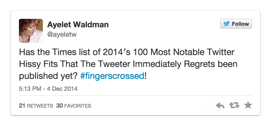 Her latest outburst concerns one of those year-end lists that tend to clog media sites come December. The New York Times, you see, rounded up “100 Notable Books of 2014,” and among the thousands of eligible volumes excluded is Waldman’s latest work, Love and Treasure—which previously garnered a favorable review in those same pages. That enviable distinction is apparently moot, and the perceived snub well worth public complaint.