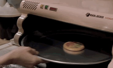 The future McFly family enjoys a "hydrated" pizza courtesy of Pizza Hut. Donut-sized when it comes out of the package, the pizza turns into a delicious helping of product placement after only a few seconds in the Black and Decker Hydrator.