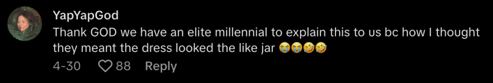 Some people on the thread assumed that the basque waist had the silhouette of a mason jar, and were grateful to have the record set straight. @yapyapgod commented, “Thank GOD we have an elite millennial to explain this to us because…I thought they meant the dress looked like the jar.”