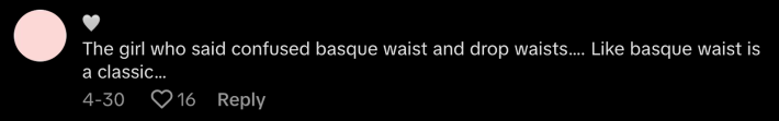 “The girl who said confused basque waist and drop waists…like basque waist is a classic…” said @igc94444.