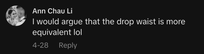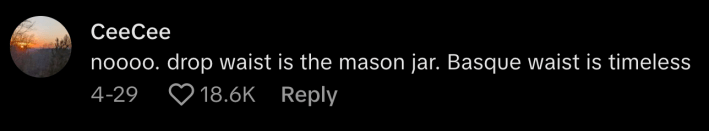 “I would argue that the drop waist is more equivalent, lol,” commented @chaudown24. @312_ccc replied, “Drop waist is the mason jar. Basque waist is timeless.”