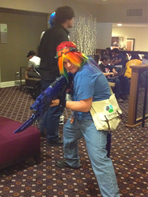 Alex has seen every My Little Pony episode and can likely recite every line. Throughout the weekend, he's carrying a handheld speaker system that's playing brony music through a bluetooth connection on his phone. He's like this guy, except he's just dressed up like this thing called a Changeling.