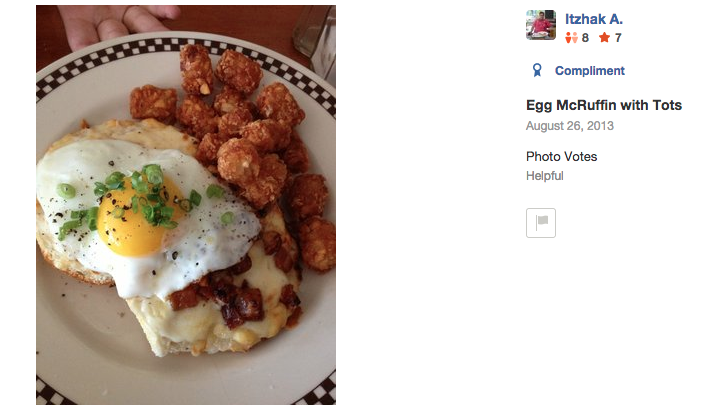 This gut-bomb of a sandwich is the best hangover food ever made; it’s custom-made for soaking up last night's liquor. The Egg McRuffin consists of chopped smoked bacon and white cheddar and bechamel sauce on an oversized English muffin, topped with a fried egg and scallions, and served with a side of tater tots. It's surprisingly easy to eat as a sandwich, and the bechamel adds a hint of McMuffin-esque creaminess.