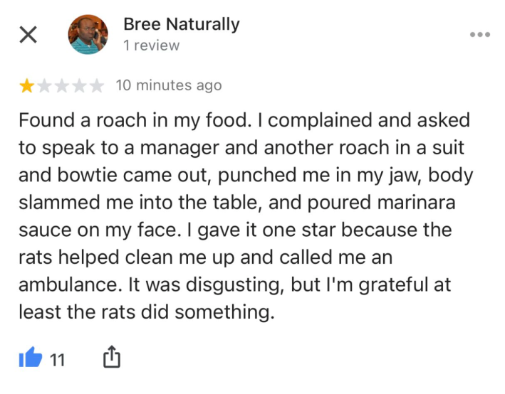 “Found a roach in my food. I complained and asked to speak to a manager and another roach in a suit and bowtie came out, punched me in my jaw, body slammed me into the table, and poured marinara sauce on my face. I gave it one star because the rats helped clean me up and called me an ambulance. It was disgusting, but I’m grateful at least the rats did something,” one review said.