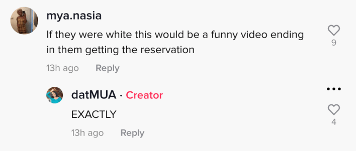 “If they were white, this would be a funny video ending in them getting the reservation,” one user commented. The TikToker replied, “EXACTLY.”