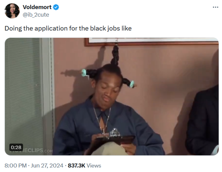 "Doing the application for the black jobs like" wrote one user over a clip of the character "Loc Dog" from the 1996 film Don't Be a Menace to South Central While Drinking Your Juice in the Hood filling out a job application.