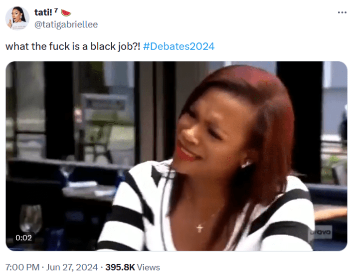 When straight answers to the questions about the meaning of the term “Black jobs” were not forthcoming, Black Twitter did what they do best. Joke tweets using reaction images and funny gifs and videos paired with remarks about Black jobs, including the working and pursuit thereof, proliferated across the platform on debate night and the day after.